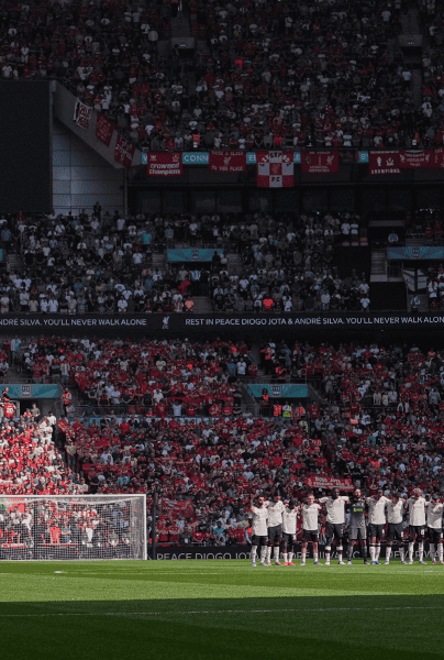 Los jugadores del Liverpool y del Crystal Palace guardan un minuto de silencio en memoria de Diogo Jota y Andre Silva antes del duelo por el Community Shield en Londres, el domingo 10 de agosto. AP / ARCHIVO